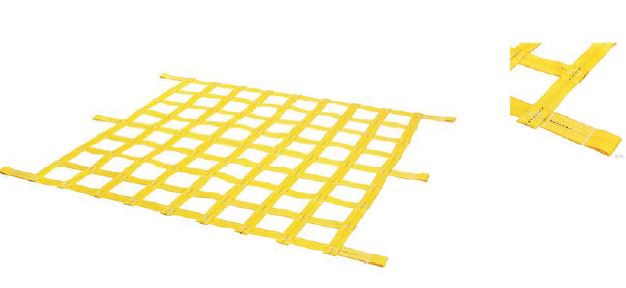 PES-Gurtbandnetz, Maschenweite 95, 215 oder 335 mm, Gurtbandbreite 35 mm, Gurtband-Reißfestigkeit 2.000 daN, äußerst formstabil, 6 Schlaufen á 5 cm (Standard), Netzbruchfestigkeit 41 kN, UV-stabil
